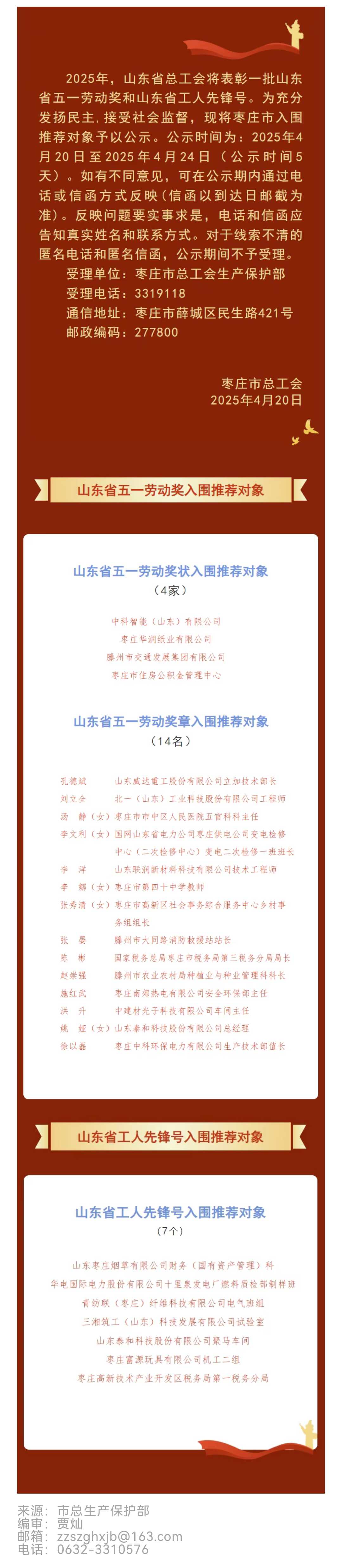 2025年山东省五一劳动奖和山东省工人先锋号入围推荐对象公示
