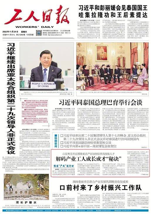 11月20日出版的《工人日报》在头版刊登了题为 《山东枣庄市总围绕重点产业加快培养高技能人才  解码产业工人成长成才“秘诀”》的文章,对枣庄持续深化产业工人队伍建设改革进行了报道。
